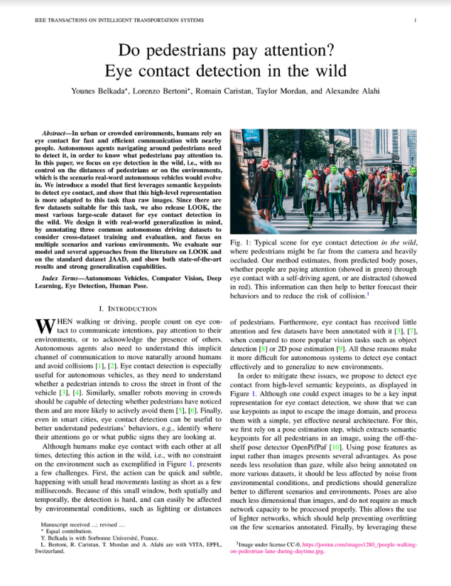 In-the-wild eye contact detection Typical scene for eye contact detection in the wild, where pedestrians might be far from the camera and heavily occluded. Our method estimates, from predicted body poses, whether people are paying attention (showed in green) through eye contact with a self-driving agent, or are distracted (showed in red). This information can then be used as an external modality to better forecast their behaviors and to reduce the risk of collision.